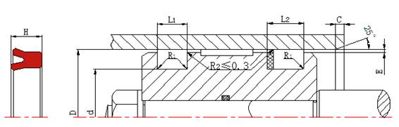 | 缸徑 D H9 | 溝槽底徑 d h9 | H | 槽寬L1 +0.2 | 槽寬L2 +0.2 | R1≤ | C≥ |
