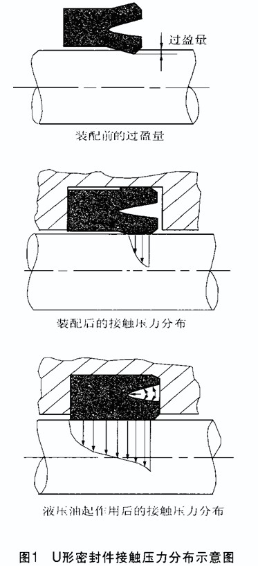 唇形密封件是指受壓呈唇形并具有壓力強(qiáng)化密封作用的一類密封件或襯墊。其結(jié)構(gòu)形式很多,除標(biāo)準(zhǔn)的V形、U形、Y形、L形和J形外,還有由這些形狀演變而來(lái)的各種特殊形狀。唇形密封件的密封原理是依靠密封件唇口與配合面之間的過(guò)盈量和工作介質(zhì)的壓力使唇形密封件產(chǎn)生彈性變形,以封堵相對(duì)運(yùn)動(dòng)兩零件之間的間隙,達(dá)到密封的目的。圖1是U形往復(fù)運(yùn)動(dòng)密封件( U形密封件是油壓缸中使用廣泛的油封,它是一種典型的唇口密封件,無(wú)論用于活塞或是活塞桿都能獲得良好的密封效果。主要應(yīng)用于重載行走機(jī)械或工業(yè)液壓中的活塞或活塞桿密封。)裝配和接觸壓力的分布示意圖,密封件裝入安裝槽時(shí)內(nèi)唇口與桿件相接觸發(fā)生變形,當(dāng)液壓油加壓后其整個(gè)滑動(dòng)面與桿件的表面完全貼合在一起。