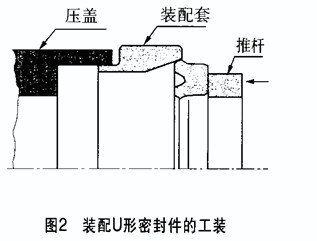 裝配唇形密封件時(shí)沒(méi)有使用專用工具,或長(zhǎng)期懸掛在鐵絲上存放,均會(huì)造成唇形密封件損壞而漏油。圖2為U形密封件從唇部安裝時(shí)采用的工裝,它能地避免唇形密封件的唇頂被損傷。當(dāng)配合面的倒角不當(dāng)時(shí),可在軸肩倒150~30°角,以避免唇形密封件損傷;如果因結(jié)構(gòu)限制不能倒角時(shí),應(yīng)在裝配時(shí)使用專用套筒等工裝。顆粒性雜質(zhì)進(jìn)入系統(tǒng)后,附著在唇形密封件的配合面上,會(huì)造成唇形密封件受損。應(yīng)按時(shí)更換油,定期清潔和更換濾油器,以避免唇形密封件劃傷。