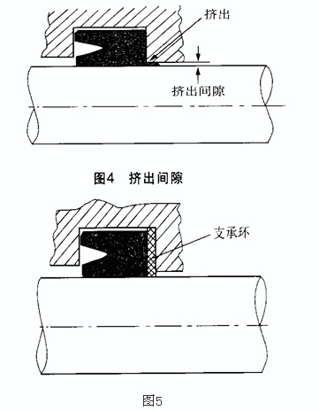 如果唇形密封件所受壓力與其背后的間隙不相適應(yīng),或支承環(huán)使用不當(dāng),會(huì)使唇形密封件的跟部進(jìn)入間隙而損壞,從而造成漏油(見(jiàn)圖4)。合理設(shè)置支承環(huán)可防止唇形密封件跟部被擠出(見(jiàn)圖5)。