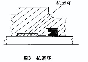 微動(dòng)時(shí)低壓過(guò)高或行程過(guò)小,均會(huì)使油膜破裂、潤(rùn)滑不足,造成表面鏡面磨損,應(yīng)改進(jìn)唇形密封件結(jié)構(gòu),增加抗磨環(huán)(見(jiàn)圖3);側(cè)壓過(guò)大,使抗磨環(huán)或活塞、軸承側(cè)向負(fù)茍過(guò)大,導(dǎo)致軸承磨損不均,若抗磨環(huán)不適合,也會(huì)造成滑動(dòng)面不均勻磨損,應(yīng)當(dāng)更換抗磨環(huán);軸的偏心過(guò)大,使油封安裝孔與軸線不同心,活塞桿與缸頭、液壓缸缸筒和活塞的偏心值超出允許值,使唇形密封件不均勻磨損,從而造成漏油。此時(shí),應(yīng)重新調(diào)整,使偏心量在允許的范圍內(nèi)。此外,配合面粗糙度大,會(huì)造成唇形密封件磨損量增大。實(shí)踐證明,軸表面粗糙度Ra=0.8~1.6μm、孔的表面粗糙度Ra=0.8~3.2μm時(shí),就會(huì)使唇形密封件達(dá)到合理的壽命。
