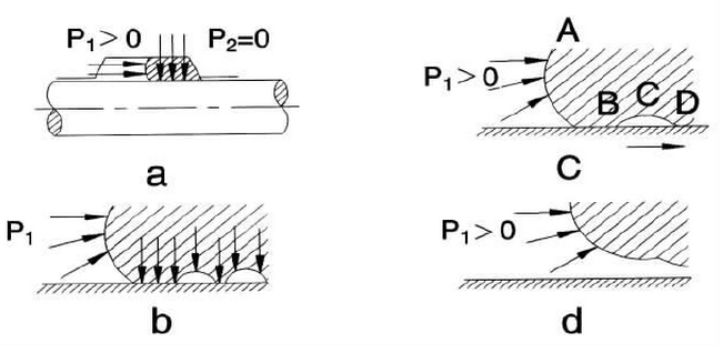 O形密封圈用做往復(fù)運(yùn)動密封時,其預(yù)密封效果和自密封作用與靜密封一樣。但由于桿運(yùn)動時很容易將流體帶到O形密封圈和桿之間,因此,情況比靜密封復(fù)雜,假設(shè)流體為潤滑油,壓力只作用于其接觸O形密封圈一側(cè)(圖3 a),若將O形密封圈與桿接觸部位放大(圖3 b)其接觸表面實(shí)際上是凹凸不平的,并非每一點(diǎn)都與金屬表面接觸。O形密封圈左方作用著油壓Pi。由于自封作用的存在,O形密封圈對桿產(chǎn)生的接觸壓力大于Pi 而得到密封。但當(dāng)自桿開始向右運(yùn)動時,粘附在桿上的油被帶到楔形狹縫(圖3 c),由于流體動壓效應(yīng),這部分油的壓力比Pi 大,當(dāng)它大于O形密封圈對桿的接觸壓力時,油便擠入O形密封圈的凹處(圖3 d),桿繼續(xù)向右滑動,油又進(jìn)入下一凹處,依次向右推移,油便沿著桿運(yùn)動的方向泄露。當(dāng)桿向左運(yùn)動時,由于桿運(yùn)動方向與桿壓力方向相反,故不易泄露。