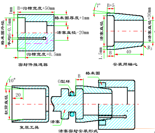 由于聚氨酯材質(zhì)的Y型圈硬度高、預壓縮量大,在安裝、更換時常常會造成密封圈被擠破、翻卷和咬邊等損壞現(xiàn)象,從而起不到應(yīng)有的密封效果,甚至失效。裝配時,我們曾用螺絲刀將密封唇沿缸徑往里壓;或用細鐵絲將密封圈的外唇捆緊,使其外徑小于缸的內(nèi)徑,然后將密封圈送入缸內(nèi),再將細鐵絲抽出。但這兩種裝法都容易將密封圈劃傷,導致密封失效,增加維修時間。針對這種情況,我們用0.lmm厚的冷軋鋼帶或銅皮將其剪成長方形,其長度等于Y形圈外徑的周長,然后用它將密封圈裹緊,再一點一點地送入液壓缸缸筒中,待外唇口全部進入缸筒后再將其抽出,安裝效果較好。